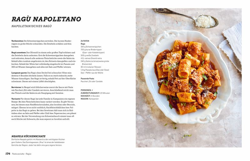 Anschließend folgt eine umfangreiche Rezeptsammlung, die sinnvoll untergliedert ist in Pasta in Brodo (Brühen und Suppen), Pasta asciutta (Gerichte mit Gemüse, Fleisch und Fisch), Pasta al Forno (Gerichte aus dem Backofen), Gnocchi und Pasta dolce (süße Pastaspeisen). Hier bleiben tatsächlich keine Wünsche offen! Unter den Rezepten sind alle mir bekannten italienischen Klassiker wie Ragù alla Bolognese, Fettuccine Alfredo und Lasagne al Ragù Bolognese zu finden. Jedes Rezept ist mit einem großformatigen Foto versehen, das Lust macht, das eine oder andere nachzukochen. Angaben zu den benötigten Zutaten, der Personenanzahl sowie der Zubereitungs- und Kochzeit findet man übersichtlich am Rand jeder Seite. Besonders gut gefällt mir, dass hier auch darauf hingewiesen wird, aus welcher Region Italiens das jeweilige Gericht stammt. Zur schnelleren Orientierung hätte man ggf. noch Symbole ergänzen können, die auf den ersten Blick zeigen, ob ein Rezept Fleisch oder Fisch enthält oder ob es vegetarisch bzw. vegan ist. Die Zubereitung der Gerichte ist leicht verständlich beschrieben. Mittlerweile habe ich schon Einiges nachgekocht. Vieles ist gut gelungen und hat allen geschmeckt, manches werde ich hinsichtlich einzelner Zutaten oder ihrer Mengenangaben künftig aber ein wenig anpassen.