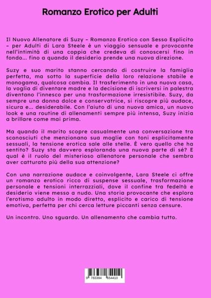 Il Nuovo Allenatore di Suzy - Romanzo Erotico con Sesso Esplicito - per Adulti di Lara Steele è un viaggio sensuale e provocante nell'intimità di una coppia che credeva di conoscersi fino in fondo... fino a quando il desiderio prende una nuova direzione.Suzy e suo marito stanno cercando di costruire la famiglia perfetta, ma sotto la superficie della loro relazione stabile e monogama, qualcosa cambia. Il trasferimento in una nuova casa, la voglia di diventare madre e la decisione di iscriversi in palestra diventano l'innesco per una trasformazione irresistibile. Suzy, da sempre una donna dolce e conservatrice, si riscopre più audace, sicura e... desiderabile. Con l'aiuto di una nuova amica, un nuovo look e una routine di allenamenti sempre più intensa, Suzy inizia a brillare come mai prima.Ma quando il marito scopre casualmente una conversazione tra sconosciuti che menzionano sua moglie con toni esplicitamente sessuali, la tensione erotica sale alle stelle. È vero quello che ha sentito? Suzy sta davvero esplorando una nuova parte di sé? E qual è il ruolo del misterioso allenatore personale che sembra aver catturato più della sua attenzione?Con una narrazione audace e coinvolgente, Lara Steele ci offre un romanzo erotico ricco di suspense sessuale, trasformazione personale e tensioni interrazziali, dove il confine tra fedeltà e desiderio viene messo a nudo. Una storia provocante che esplora l'erotismo adulto in modo diretto, esplicito e carico di tensione emotiva, perfetta per chi cerca letture piccanti senza censure.Un incontro. Uno sguardo. Un allenamento che cambia tutto.
