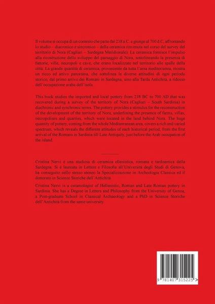 Il volume si occupa di un contesto che parte dal 238 a.C. e giunge al 700 d.C, affrontando lo studio - diacronico e sincronico - della ceramica rinvenuta nel corso del survey del territorio di Nora (Cagliari - Sardegna Meridionale). La ceramica fornisce l’impulso alla ricostruzione dello sviluppo del paesaggio di Nora, sottolineando la presenza di fattorie, ville, necropoli e cave, che erano localizzate nel territorio alle spalle della città. La grande quantità di ceramica, proveniente da tutta l’area mediterranea, mostra un ricco ed attivo panorama, che sottolinea le diverse attitudini di ogni periodo storico, dal primo arrivo dei Romani in Sardegna, sino alla Tarda Antichità, a ridosso dell’occupazione araba dell’isola. This book studies the imported and local pottery from 238 BC to 700 AD that was recovered during a survey of the territory of Nora (Cagliari - South Sardinia) in diachronic and synchronic terms. The pottery provides a stimulus for the reconstruction of the development of the territory of Nora, underlining the presence of farms, villas, necropolises and quarries, which were located in the land behind Nora. The huge quantity of pottery, coming from the whole Mediterranean area, covers a rich and varied spectrum, which reveals the different attitudes of each historical period, from the first arrival of the Romans in Sardinia till Late Antiquity, just before the Arab occupation of the island.