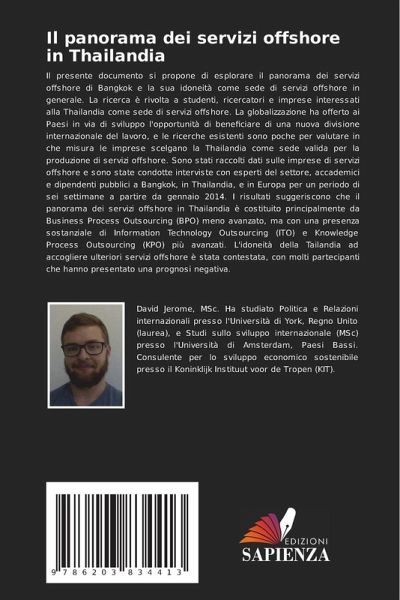 Il presente documento si propone di esplorare il panorama dei servizi offshore di Bangkok e la sua idoneità come sede di servizi offshore in generale. La ricerca è rivolta a studenti, ricercatori e imprese interessati alla Thailandia come sede di servizi offshore. La globalizzazione ha offerto ai Paesi in via di sviluppo l'opportunità di beneficiare di una nuova divisione internazionale del lavoro, e le ricerche esistenti sono poche per valutare in che misura le imprese scelgano la Thailandia come sede valida per la produzione di servizi offshore. Sono stati raccolti dati sulle imprese di servizi offshore e sono state condotte interviste con esperti del settore, accademici e dipendenti pubblici a Bangkok, in Thailandia, e in Europa per un periodo di sei settimane a partire da gennaio 2014. I risultati suggeriscono che il panorama dei servizi offshore in Thailandia è costituito principalmente da Business Process Outsourcing (BPO) meno avanzato, ma con una presenza sostanziale di Information Technology Outsourcing (ITO) e Knowledge Process Outsourcing (KPO) più avanzati. L'idoneità della Tailandia ad accogliere ulteriori servizi offshore è stata contestata, con molti partecipanti che hanno presentato una prognosi negativa.