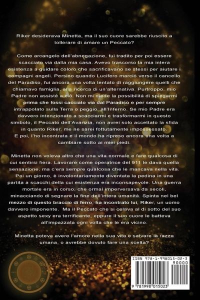 Riker desiderava Minetta, ma il suo cuore sarebbe riuscito a tollerare di amare un Peccato? Come arcangelo dell'abnegazione, fui tradito per poi essere scacciato via dalla mia casa. Avevo trascorso la mia intera esistenza a guidare coloro che sacrificavano se stessi per aiutare i compagni angeli. Persino quando Lucifero marciò verso il cancello del Paradiso, fui ancora una volta tentato di raggiungere quelli che chiamavo famiglia, alla ricerca di un'alternativa. Purtroppo, mio Padre non assisté a ciò. Non mi diede la possibilità di spiegarmi prima che fossi cacciato via dal Paradiso e per sempre intrappolato sulla Terra o peggio, all'Inferno. Se mio Padre era davvero intenzionato a scacciarmi e trasformarmi in questo simbolo, il Peccato dell'Avarizia, non avrei solo accettato la sfida in quanto Riker, me ne sarei fottutamente impossessato. E poi, l'ho incontrata e il mondo ha ripreso ancora una volta a cambiare sotto ai miei piedi. Minetta non voleva altro che una vita normale e fare qualcosa di cui sentirsi fiera. Lavorare come operatrice del 911 le dava quella sensazione, ma c'era sempre qualcosa che le mancava nella vita. Poi un giorno, è involontariamente diventata la pedina in una partita a scacchi della cui esistenza era inconsapevole. Una guerra mortale era in corso, che ormai imperversava da secoli, minacciando di segnare la fine dell'intera umanità. Spinta nel bel mezzo di questo braccio di ferro, ha incontrato lui, Riker, un uomo davvero imponente. Ma il Peccato che si celava al di sotto del suo aspetto sexy era terrificante, eppure il suo cuore le batteva all'impazzata ogni volta che le era vicino. Minetta poteva avere l'amore nella sua vita e salvare la razza umana, o avrebbe dovuto fare una scelta?