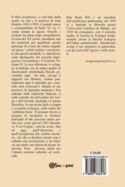 Il libro ricostruisce la vita e il pensiero di Jean Guitton (1901-1999), il grande amico di Paolo VI, a quasi vent¿anni dalla sua morte. La vicenda umana di questo scrittore e filosofo cristiano ha attraversato quasi integralmente il XX secolo quale testimone diretto di eventi epocali: i primi tentativi ecumenici, le due guerre mondiali, le radicalizzazioni ideologiche del secondo dopoguerra, l¿era atomica e il Concilio Vaticano II. Il primo capitolo del volume è dedicato alla ricostruzione della vita di Guitton e alle sue prime sintesi accademiche; ed esso fanno seguito seguono altri due capitoli che trattano della sua antropologia (il tempo, il pudore, l'amore umano) e della sua cristologia filosofica (le condizioni di possibilità della rivelazione, la filosofia della risurrezione, la sua innovativa mariologia). Ne viene il ritratto di un pensiero di impronta umanista e ben radicato nella tradizione francese che forse, come già lamentava Yves Congar nel 1963, non ha avuto, fino ad oggi, quell¿attenzione e quell¿accoglienza che sembra meritare.
