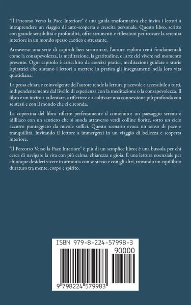 "Il Percorso Verso la Pace Interiore" è una guida trasformativa che invita i lettori a intraprendere un viaggio di auto-scoperta e crescita personale. Questo libro, scritto con grande sensibilità e profondità, offre strumenti e riflessioni per trovare la serenità interiore in un mondo spesso caotico e stressante. Attraverso una serie di capitoli ben strutturati, l'autore esplora temi fondamentali come la consapevolezza, la meditazione, la gratitudine, e l'arte del vivere nel momento presente. Ogni capitolo è arricchito da esercizi pratici, meditazioni guidate e storie ispiratrici che aiutano i lettori a mettere in pratica gli insegnamenti nella loro vita quotidiana. La prosa chiara e coinvolgente dell'autore rende la lettura piacevole e accessibile a tutti, indipendentemente dal livello di esperienza con la meditazione o la consapevolezza. Il libro è un invito a rallentare, a riflettere e a coltivare una connessione più profonda con se stessi e con il mondo che ci circonda. La copertina del libro riflette perfettamente il contenuto: un paesaggio sereno e idilliaco con un sentiero che si snoda attraverso verdi colline fiorite, sotto un cielo azzurro punteggiato da nuvole soffici. Questo scenario evoca un senso di pace e tranquillità, invitando il lettore a immergersi in un viaggio di bellezza e scoperta interiore. "Il Percorso Verso la Pace Interiore" è più di un semplice libro; è una bussola per chi cerca di navigare la vita con più calma, chiarezza e gioia. È una lettura essenziale per chiunque desideri vivere in armonia con se stesso e con gli altri, trovando un equilibrio duraturo tra mente, corpo e spirito.