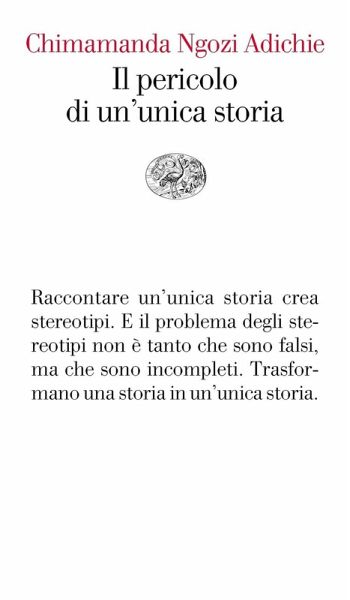 «Quando rifiutiamo l'unica storia, quando ci rendiamo conto che non c'è mai un'unica storia per nessun luogo, riconquistiamo una sorta di paradiso». Così si esprime Chimamanda Ngozi Adichie in questo mirabile testo, che riprende la sua prima celebre conferenza TED del 2009. È un libro di estrema universalità e attualità. Riguarda il rischio che corriamo ogni volta che semplifichiamo, vedendo la realtà attraverso un unico punto di vista. Adichie racconta così come ha trovato la sua autentica voce culturale. È particolarmente interessante il sovrapporsi di due piani diversi: quello della poetica dello scrittore (la voce che lo scrittore deve trovare); e quello civile e politico: il pericolo di un'unica storia è il pericolo dell'appiattimento culturale, di una visione identitaria che cancella culture e punti di vista alternativi. «Molte storie sono importanti. Le storie sono state usate per espropriare e per diffamare. Ma le storie si possono usare anche per dare forza e umanizzare. Le storie possono spezzare la dignità di un popolo. Ma le storie possono anche riparare quella dignità spezzata».
