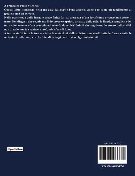 A Francesco Paolo Michetti Questo libro, composto nella tua casa dall'ospite bene accetto, viene a te come un rendimento di grazie, come un ex-voto. Nella stanchezza della lunga e grave fatica, la tua presenza m'era fortificante e consolante come il mare. Nei disgusti che seguivano il doloroso e capzioso artifizio dello stile, la limpida semplicità del tuo ragionamento m'era esempio ed emendazione. Ne' dubbii che seguivano lo sforzo dell'analisi, non di rado una tua sentenza profonda m'era di lume. A te che studii tutte le forme e tutte le mutazioni dello spirito come studii tutte le forme e tutte le mutazioni delle cose, a te che intendi le leggi per cui si svolge l'interior vit...