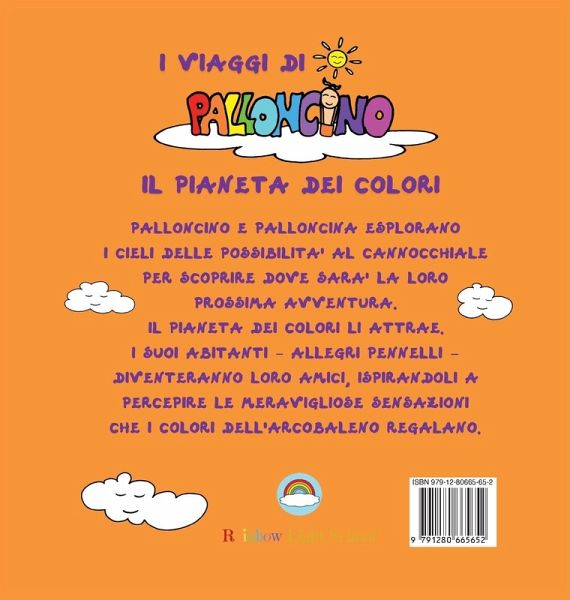 PALLONCINO E PALLONCINA ESPLORANO I CIELI DELLE POSSIBILITA' AL CANNOCCHIALE PER SCOPRIRE DOVE SARA' LA LORO PROSSIMA AVVENTURA. IL PIANETA DEI COLORI LI ATTRAE. I SUOI ABITANTI - ALLEGRI PENNELLI - DIVENTERANNO LORO AMICI, ISPIRANDOLI A PERCEPIRE LE MERAVIGLIOSE SENSAZIONI CHE I COLORI DELL'ARCOBALENO REGALANO.