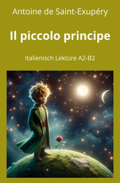 Italienisch lernen mit klassischen Werken. Die Bücher dieser Reihe eignen sich für Jugendliche und Erwachsene, die mit klassischen Werken ihre Lesefähigkeit verbessern wollen. Italienisch Niveaus A2 bis B2. Durchgehend in italienischer Sprache. "Der kleine Prinz" ist ein philosophisches Märchen von Antoine de Saint-Exupéry, das erstmals 1943 veröffentlicht worden ist. Es zählt zu den meistgelesenen Büchern weltweit. Die Geschichte handelt von einem kleinen Prinzen, der von einem fernen Asteroiden stammt, auf dem er drei Vulkane und eine stolze Rose pflegt. Die Erzählung beginnt, als der kleine Prinz die Erde besucht. Auf der Erde trifft der kleine Prinz auf eine Vielzahl von Charakteren, darunter eine Schlange, einen Fuchs und schließlich den Erzähler, einen Piloten, der in der Sahara notgelandet ist. "Der kleine Prinz" ist eine bewegende Erzählung, die sowohl Kinder als auch Erwachsene anspricht und zum Nachdenken über die wirklich wichtigen Dinge im Leben anregt. Sie bleibt ein zeitloses Werk, das Fragen der Liebe, Verantwortung und des menschlichen Daseins auf poetische Weise erkundet.