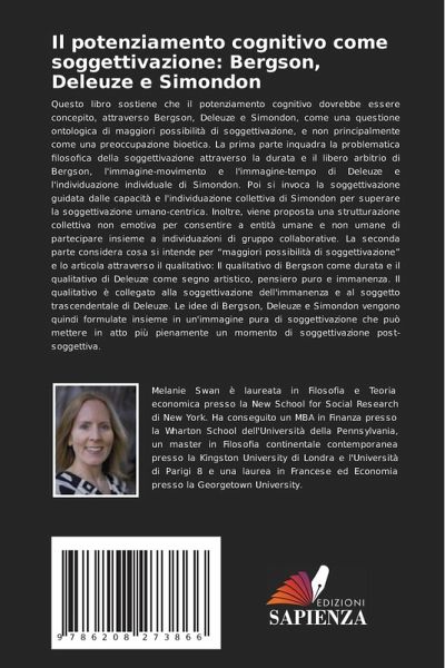 Questo libro sostiene che il potenziamento cognitivo dovrebbe essere concepito, attraverso Bergson, Deleuze e Simondon, come una questione ontologica di maggiori possibilità di soggettivazione, e non principalmente come una preoccupazione bioetica. La prima parte inquadra la problematica filosofica della soggettivazione attraverso la durata e il libero arbitrio di Bergson, l'immagine-movimento e l'immagine-tempo di Deleuze e l'individuazione individuale di Simondon. Poi si invoca la soggettivazione guidata dalle capacità e l'individuazione collettiva di Simondon per superare la soggettivazione umano-centrica. Inoltre, viene proposta una strutturazione collettiva non emotiva per consentire a entità umane e non umane di partecipare insieme a individuazioni di gruppo collaborative. La seconda parte considera cosa si intende per ¿maggiori possibilità di soggettivazione¿ e lo articola attraverso il qualitativo: Il qualitativo di Bergson come durata e il qualitativo di Deleuze come segno artistico, pensiero puro e immanenza. Il qualitativo è collegato alla soggettivazione dell'immanenza e al soggetto trascendentale di Deleuze. Le idee di Bergson, Deleuze e Simondon vengono quindi formulate insieme in un'immagine pura di soggettivazione che può mettere in atto più pienamente un momento di soggettivazione post-soggettiva.