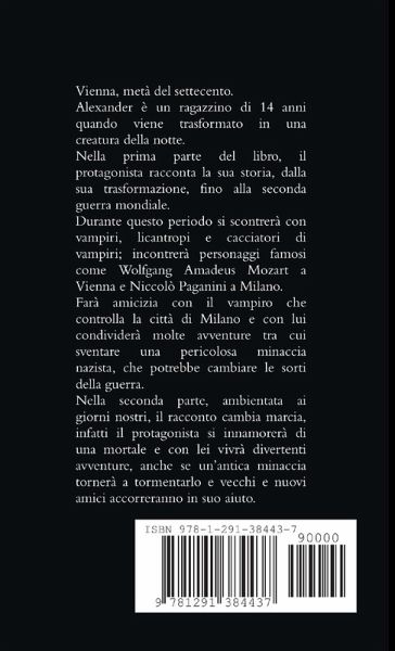 Vienna, metà del settecento. Alexander è un ragazzino di 14 anni quando viene trasformato in una creatura della notte. Nella prima parte del libro, il protagonista racconta la sua storia, dalla sua trasformazione, fino alla seconda guerra mondiale. Durante questo periodo si scontrerà con vampiri, licantropi e cacciatori di vampiri; incontrerà personaggi famosi come Wolfgang Amadeus Mozart a Vienna e Niccolò Paganini a Milano. Farà amicizia con il vampiro che controlla la città di Milano e con lui condividerà molte avventure tra cui sventare una pericolosa minaccia nazista, che potrebbe cambiare le sorti della guerra. Nella seconda parte, ambientata ai giorni nostri, il racconto cambia marcia, infatti il protagonista si innamorerà di una mortale e con lei vivrà divertenti avventure, anche se un'antica minaccia tornerà a tormentarlo e vecchi e nuovi amici accorreranno in suo aiuto.