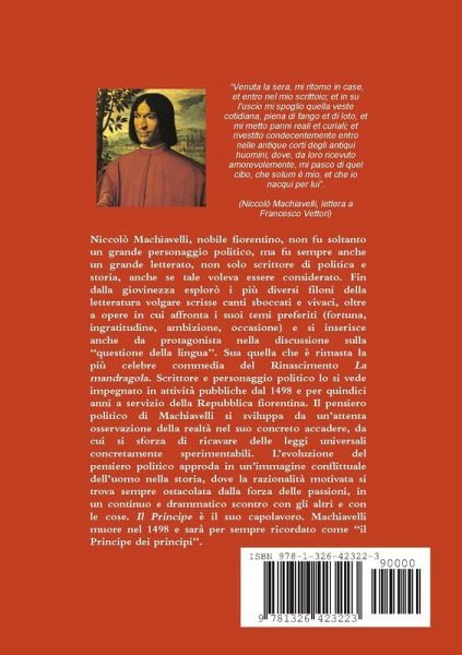 Nuova edizione completa del 2014 de Il Principe, di Niccolò Machiavelli. Paperback, copertina flessibile a colori intensi, effetto opacizzato. Editing con suddivisione in paragrafi per agevolare la lettura del testo. Disponibile su tutti i canali Amazon.t. Amazon.co.uk, Amazon.com Un'opera di filosofia politica del Sedicesimo secolo indispensabile ad una libreria completa. In copertina, il ritratto originale di Lorenzo de' Medici, detto "Il Magnifico", a cui Machiavelli dedicò il suo trattato.