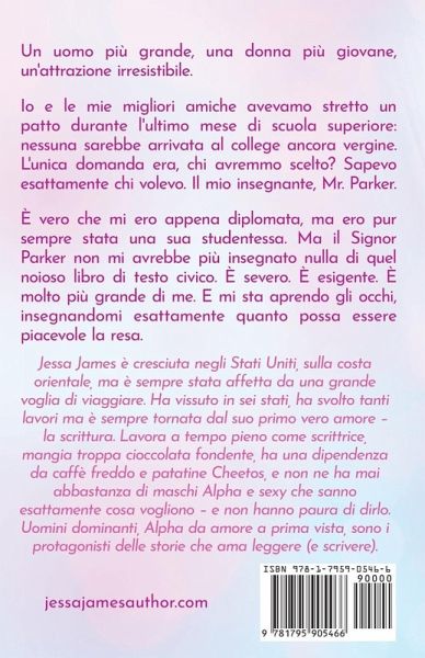 Un uomo più grande, una donna più giovane, un'attrazione irresistibile. Io e le mie migliori amiche avevamo stretto un patto durante l'ultimo mese di scuola superiore: nessuna sarebbe arrivata al college ancora vergine. L'unica domanda era, chi avremmo scelto? Sapevo esattamente chi volevo. Il mio insegnante, Mr. Parker. È vero che mi ero appena diplomata, ma ero pur sempre stata una sua studentessa. Ma il Signor Parker non mi avrebbe più insegnato nulla di quel noioso libro di testo civico. È severo. È esigente. È molto più grande di me. E mi sta aprendo gli occhi, insegnandomi esattamente quanto possa essere piacevole la resa.