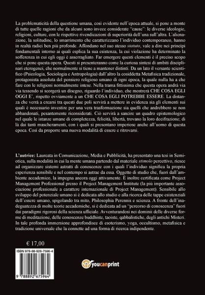 La problematicità umana, oggi così evidente, si pone a monte di tutte quelle ragioni che sono considerate "cause": ideologie, religioni, culture e le rispettive rivendicazioni di superiorità dell'una sull'altra. L'alienazione, la solitudine, che caratterizzano l'individuo contemporaneo, hanno in realtà radici più profonde. Affondano nei princìpi fondamentali che regolano la sua esistenza, la cui violazione è causa della sofferenza in cui oggi è barricato. Far emergere questi elementi è il preciso scopo di quest'opera. Questi affioreranno come la sintesi di ambiti disciplinari, normalmente mantenuti distinti. Da un lato la scienza (Psicologia, Sociologia e Antropologia) dall'altro la Metafisica tradizionale, protagonista assoluta del pensiero religioso di ogni epoca. Nella trama che si andrà tessendo si scorgerà un disegno, riguardo l'individuo, che mostrerà che cosa egli oggi è, rispetto ovviamente a un che cosa egli potrebbe essere. La distanza tra questi due poli metterà in evidenza sia gli elementi sui quali è necessario investire sia quelli che andrebbero se non abbandonati, pesantemente riconsiderati, al fine di edificare una nuova modalità di essere e ritrovarsi.