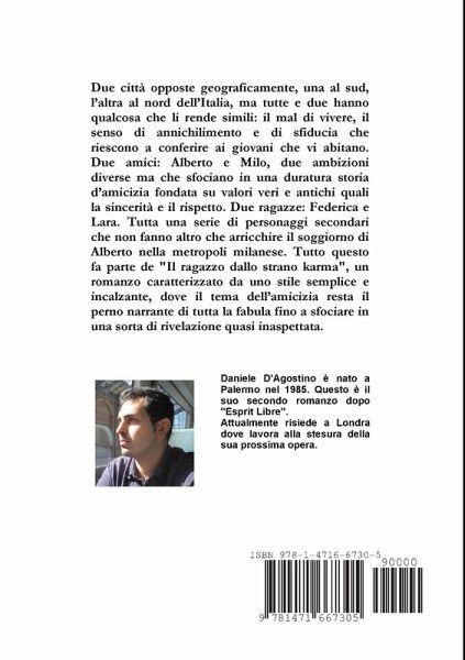 Due città opposte geograficamente, una al sud, l'altra al nord dell'Italia, ma tutte e due hanno qualcosa che li rende simili: il mal di vivere, il senso di annichilimento e di sfiducia che riescono a conferire ai giovani che vi abitano. Due amici: Alberto e Milo, due ambizioni diverse ma che sfociano in una duratura storia d'amicizia fondata su valori veri e antichi quali la sincerità e il rispetto. Due ragazze: Federica e Lara. Tutta una serie di personaggi secondari che non fanno altro che arricchire il soggiorno di Alberto nella metropoli milanese. Tutto questo fa parte de "Il ragazzo dallo strano karma".