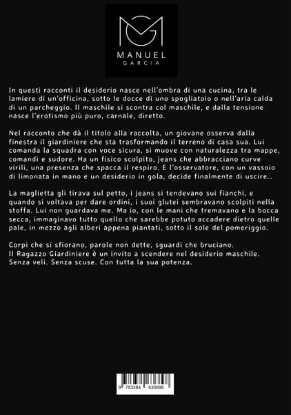 In questi racconti il desiderio nasce nell'ombra di una cucina, tra le lamiere di un'officina, sotto le docce di uno spogliatoio o nell'aria calda di un parcheggio. Il maschile si scontra col maschile, e dalla tensione nasce l'erotismo più puro, carnale, diretto.Nel racconto che dà il titolo alla raccolta, un giovane osserva dalla finestra il giardiniere che sta trasformando il terreno di casa sua. Lui comanda la squadra con voce sicura, si muove con naturalezza tra mappe, comandi e sudore. Ha un fisico scolpito, jeans che abbracciano curve virili, una presenza che spacca il respiro. E l'osservatore, con un vassoio di limonata in mano e un desiderio in gola, decide finalmente di uscire...La maglietta gli tirava sul petto, i jeans si tendevano sui fianchi, e quando si voltava per dare ordini, i suoi glutei sembravano scolpiti nella stoffa. Lui non guardava me. Ma io, con le mani che tremavano e la bocca secca, immaginavo tutto quello che sarebbe potuto accadere dietro quelle pale,in mezzo agli alberi appena piantati, sotto il sole del pomeriggio.Corpi che si sfiorano, parole non dette, sguardi che bruciano.Il Ragazzo Giardiniere è un invito a scendere nel desiderio maschile. Senza veli. Senza scuse. Con tutta la sua potenza.