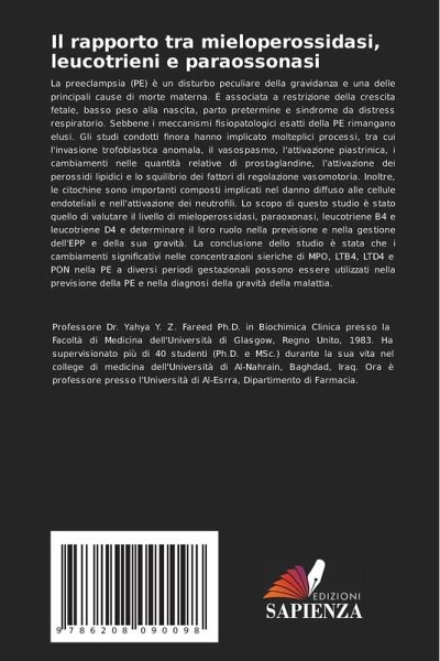 La preeclampsia (PE) è un disturbo peculiare della gravidanza e una delle principali cause di morte materna. È associata a restrizione della crescita fetale, basso peso alla nascita, parto pretermine e sindrome da distress respiratorio. Sebbene i meccanismi fisiopatologici esatti della PE rimangano elusi. Gli studi condotti finora hanno implicato molteplici processi, tra cui l'invasione trofoblastica anomala, il vasospasmo, l'attivazione piastrinica, i cambiamenti nelle quantità relative di prostaglandine, l'attivazione dei perossidi lipidici e lo squilibrio dei fattori di regolazione vasomotoria. Inoltre, le citochine sono importanti composti implicati nel danno diffuso alle cellule endoteliali e nell'attivazione dei neutrofili. Lo scopo di questo studio è stato quello di valutare il livello di mieloperossidasi, paraoxonasi, leucotriene B4 e leucotriene D4 e determinare il loro ruolo nella previsione e nella gestione dell'EPP e della sua gravità. La conclusione dello studio è stata che i cambiamenti significativi nelle concentrazioni sieriche di MPO, LTB4, LTD4 e PON nella PE a diversi periodi gestazionali possono essere utilizzati nella previsione della PE e nella diagnosi della gravità della malattia.