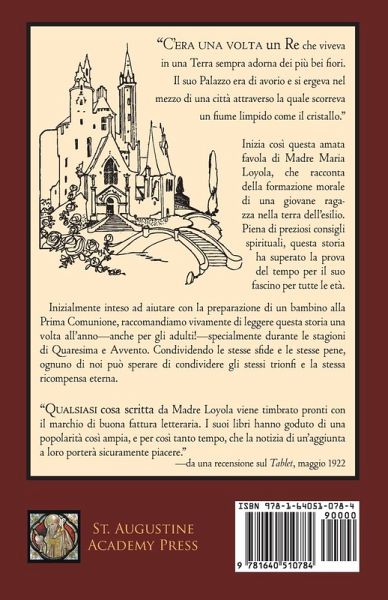 "C’era una volta un Re che viveva in una Terra sempra adorna dei più bei fiori. Il suo Palazzo era di avorio e si ergeva nel mezzo di una città attraverso la quale scorreva un fiume limpido come il cristallo." Inizia così questa amata favola di Madre Maria Loyola, che racconta della formazione morale di una giovane ragazza nella terra dell’esilio. Piena di preziosi consigli spirituali, questa storia ha superato la prova del tempo per il suo fascino per tutte le età. Inizialmente inteso ad aiutare con la preparazione di un bambino alla Prima Comunione, raccomandiamo vivamente di leggere questa storia una volta all’anno—anche per gli adulti!—specialmente durante le stagioni di Quaresima e Avvento. Condividendo le stesse sfide e le stesse pene, ognuno di noi può sperare di condividere gli stessi trionfi e la stessa ricompensa eterna.