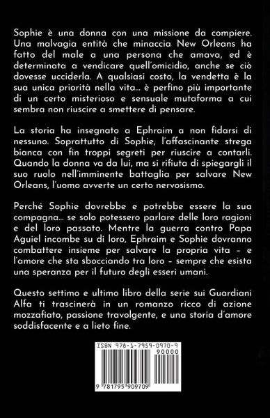 Sophie è una donna con una missione da compiere. Una malvagia entità che minaccia New Orleans ha fatto del male a una persona che amava, ed è determinata a vendicare quell'omicidio, anche se ciò dovesse ucciderla. A qualsiasi costo, la vendetta è la sua unica priorità nella vita... è perfino più importante di un certo misterioso e sensuale mutaforma a cui sembra non riuscire a smettere di pensare. La storia ha insegnato a Ephraim a non fidarsi di nessuno. Soprattutto di Sophie, l'affascinante strega bianca con fin troppi segreti per riuscire a contarli. Quando la donna va da lui, ma si rifiuta di spiegargli il suo ruolo nell'imminente battaglia per salvare New Orleans, l'uomo avverte un certo nervosismo. Perché Sophie dovrebbe e potrebbe essere la sua compagna... se solo potessero parlare delle loro ragioni e del loro passato. Mentre la guerra contro Papa Aguiel incombe su di loro, Ephraim e Sophie dovranno combattere insieme per salvare la propria vita - e l'amore che sta sbocciando tra loro - sempre che esista una speranza per il futuro degli esseri umani. Questo settimo e ultimo libro della serie sui Guardiani Alfa ti trascinerà in un romanzo ricco di azione mozzafiato, passione travolgente, e una storia d'amore soddisfacente e a lieto fine.