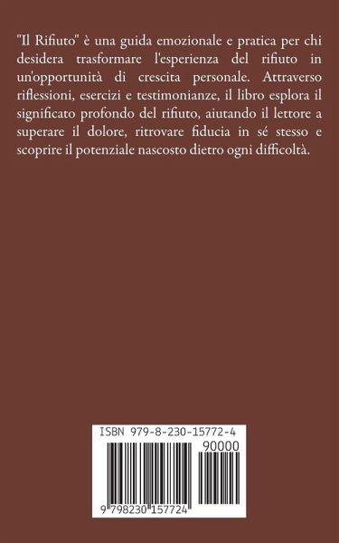 "Il Rifiuto" è una guida emozionale e pratica per chi desidera trasformare l'esperienza del rifiuto in un'opportunità di crescita personale. Attraverso riflessioni, esercizi e testimonianze, il libro esplora il significato profondo del rifiuto, aiutando il lettore a superare il dolore, ritrovare fiducia in sé stesso e scoprire il potenziale nascosto dietro ogni difficoltà.