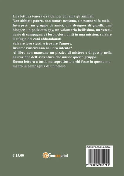 Una lettura tenera e calda, per chi ama gli animali. Non abbiate paura, non muore nessuno, e nessuno si fa male. Interpreti, un gruppo di amici, una designer di gioielli, una blogger, un poliziotto gay, un volontario bellissimo, un veterinario di campagna e i loro pelosi, uniti in una mission: salvare il rifugio dei cani abbandonati. Salvare loro stessi, e trovare l'amore. Insieme riusciranno nel loro intento? Al libro non mancano un pizzico di mistero e di gossip nella narrazione dell'avventura che unisce questo gruppo. Buona lettura a tutti, ma soprattutto a chi fosse in questo momento in compagnia di un peloso.