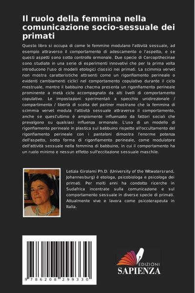 Questo libro si occupa di come le femmine modulano l'attività sessuale, ad esempio attraverso il comportamento di adescamento o l'aspetto, e se questi aspetti sono sotto controllo ormonale. Due specie di Cercopithecinae sono studiate in una serie di esperimenti innovativi che per la prima volta introducono l'uso di modelli etologici classici nei primati. La scimmia vervet non mostra caratteristiche attraenti come un rigonfiamento perineale o evidenti cambiamenti ciclici nel comportamento copulativo durante il ciclo mestruale, mentre il babbuino chacma presenta un rigonfiamento perineale prominente a metà ciclo accompagnato da alti livelli di comportamento copulativo. Le impostazioni sperimentali a specchio unidirezionale / compartimento / libertà di scelta del partner mostrano che la femmina di scimmia vervet modula l'attività sessuale attraverso il comportamento, anche se quest'ultimo è ampiamente influenzato da fattori sociali che prevalgono su qualsiasi influenza ormonale. L'uso di un modello di rigonfiamento perineale in plastica sul babbuino rispetto all'occultamento del rigonfiamento perineale con i pantaloni dimostra l'enorme potenza dell'aspetto, sotto forma di rigonfiamento perineale, come modulatore dell'attività sessuale nella femmina di babbuino, in cui il comportamento ha un ruolo minimo e nessun effetto sull'eccitazione sessuale maschile.