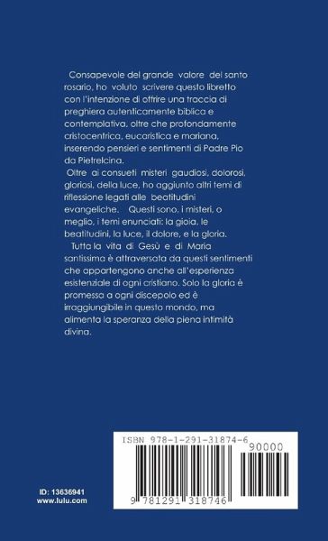 Il Santo Rosario con Padre Pio. Nuova Edizione del Rosario Eucaristico Mariano, riveduta e corretta dallo stesso autore. Il libretto offre una proposta di preghiera volta alla contemplazione del Mistero di Cristo, oltre che eucaristica e mariana, con l'inserimento di pensieri, preghiere e suggerimenti spirituali di Padre Pio da Pietrelcina. Oltre ai consueti misteri gaudiosi, dolorosi, gloriosi, della luce, ho aggiunto altri temi di riflessione legati alle beatitudini evangeliche.