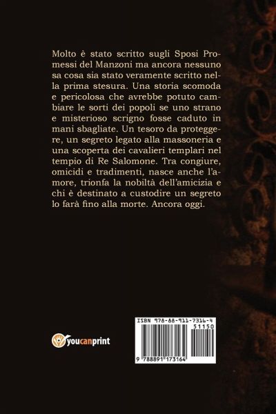 Molto è stato scritto sugli Sposi Promessi del Manzoni ma ancora nessuno sa cosa sia stato veramente scritto nella prima stesura. Una storia scomoda e pericolosa che avrebbe potuto cambiare le sorti dei popoli se uno strano e misterioso scrigno fosse caduto in mani sbagliate. Un tesoro da proteggere, un segreto legato alla massoneria e una scoperta dei cavalieri templari nel tempio di Re Salomone. Tra congiure, omicidi e tradimenti, nasce anche l'amore, trionfa la nobiltà dell'amicizia e chi è destinato a custodire un segreto lo farà fi no alla morte. Ancora oggi.
