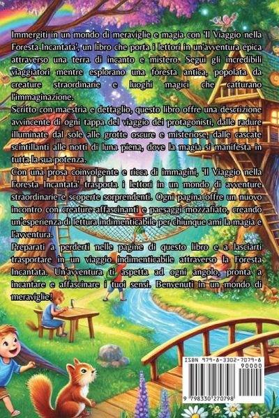 Immergiti in un mondo di meraviglie e magia con 'Il Viaggio nella Foresta Incantata', un libro che porta i lettori in un'avventura epica attraverso una terra di incanto e mistero. Segui gli incredibili viaggiatori mentre esplorano una foresta antica, popolata da creature straordinarie e luoghi magici che catturano l'immaginazione. Scritto con maestria e dettaglio, questo libro offre una descrizione avvincente di ogni tappa del viaggio dei protagonisti, dalle radure illuminate dal sole alle grotte oscure e misteriose, dalle cascate scintillanti alle notti di luna piena, dove la magia si manifesta in tutta la sua potenza. Con una prosa coinvolgente e ricca di immagini, 'Il Viaggio nella Foresta Incantata' trasporta i lettori in un mondo di avventure straordinarie e scoperte sorprendenti. Ogni pagina offre un nuovo incontro con creature affascinanti e paesaggi mozzafiato, creando un'esperienza di lettura indimenticabile per chiunque ami la magia e l'avventura. Preparati a perderti nelle pagine di questo libro e a lasciarti trasportare in un viaggio indimenticabile attraverso la Foresta Incantata. Un'avventura ti aspetta ad ogni angolo, pronta a incantare e affascinare i tuoi sensi. Benvenuti in un mondo di meraviglie!