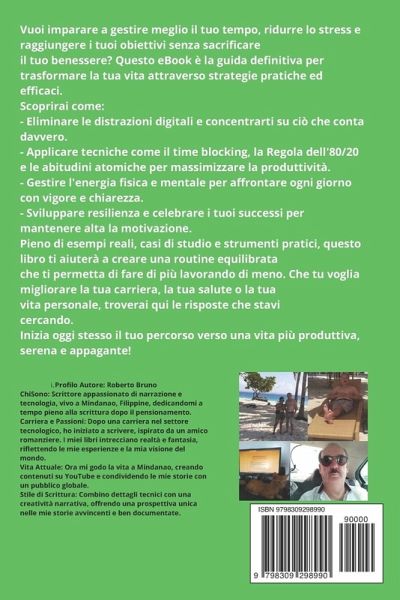 Vuoi imparare a gestire meglio il tuo tempo, ridurre lo stress e raggiungere i tuoi obiettivi senza sacrificare il tuo benessere? Questo eBook è la guida definitiva per trasformare la tua vita attraverso strategie pratiche ed efficaci. Scoprirai come: - Eliminare le distrazioni digitali e concentrarti su ciò che conta davvero. - Applicare tecniche come il time blocking, la Regola dell'80/20 e le abitudini atomiche per massimizzare la Produttività. - Gestire l'energia fisica e mentale per affrontare ogni giorno con vigore e chiarezza. - Sviluppare resilienza e celebrare i tuoi successi per mantenere alta la motivazione. Il libro e organizzato in quattro parti principali: 1. Fondamenti della Produttività Impara a costruire abitudini efficaci, eliminare distrazioni e gestire il tempo. 2. Strumenti e Tecniche Pratiche: Scopri app, strategie e storie di successo reali. 3. Benessere e Resilienza: Ottimizza energia, salute mentale e capacita di affrontare le sfide. 4. Celebrazione e Crescita Continua: Riconosci i tuoi successi e mantieni alta la motivazione. Pieno di esempi reali, casi di studio e strumenti pratici, questo libro ti aiuterà a creare una routine equilibrata che ti permetta di fare di più lavorando di meno. Che tu voglia migliorare la tua carriera, la tua salute o la tua vita personale, troverai qui le risposte che stavi cercando. Inizia oggi stesso il tuo percorso verso una vita più produttiva, serena e appagante!