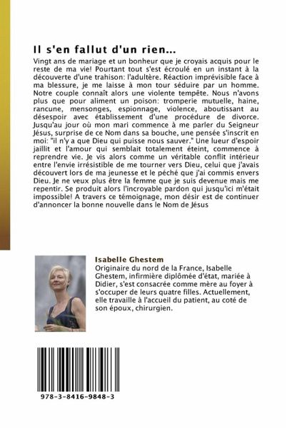 Vingt ans de mariage et un bonheur que je croyais acquis pour le reste de ma vie! Pourtant tout s'est écroulé en un instant à la découverte d'une trahison: l'adultère. Réaction imprévisible face à ma blessure, je me laisse à mon tour séduire par un homme. Notre couple connaît alors une violente tempête. Nous n'avons plus que pour aliment un poison: tromperie mutuelle, haine, rancune, mensonges, espionnage, violence, aboutissant au désespoir avec établissement d'une procédure de divorce. Jusqu'au jour où mon mari commence à me parler du Seigneur Jésus, surprise de ce Nom dans sa bouche, une pensée s'inscrit en moi: "il n'y a que Dieu qui puisse nous sauver." Une lueur d'espoir jaillit et l'amour qui semblait totalement éteint, commence à reprendre vie. Je vis alors comme un véritable conflit intérieur entre l'envie irrésistible de me tourner vers Dieu, celui que j'avais découvert lors de ma jeunesse et le péché que j'ai commis envers Dieu. Je ne veux plus être la femme que je suis devenue mais me repentir. Se produit alors l'incroyable pardon qui jusqu'ici m'était impossible! A travers ce témoignage, mon désir est de continuer d'annoncer la bonne nouvelle dans le Nom de Jésus