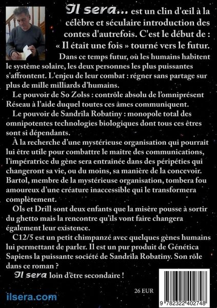 "Il sera..." est un clin d'oeil à la célèbre et séculaire introduction des contes d'autrefois. C'est le début de : "Il était une fois" tourné vers le futur.Dans ce temps futur, où les humains habitent le système solaire, les deux personnes les plus puissantes s'affrontent. L'enjeu de leur combat : régner sans partage sur plus de mille milliards d'humains.Le pouvoir de So Zolss: contrôle absolu de l'omniprésent Réseau à l'aide duquel toutes ces âmes communiquent.Le pouvoir de Sandrila Robatiny: monopole total des omnipotentes technologies biologiques dont tous ces êtres sont si dépendants.À la recherche d'une mystérieuse organisation qui pourrait lui être utile pour combattre le maître des communications, l'impératrice du gène sera entraînée dans des péripéties qui changeront sa vie, ou du moins, sa manière de la concevoir.Bartol, membre de la mystérieuse organisation, tombera fou amoureux d'une créature inaccessible qui le transformera complètement.Ols et Drill sont deux enfants que la misère pousse à sortir du ghetto mais la rencontre qu'ils vont faire changera également leur existence.C12/5 est un petit chimpanzé avec quelques gènes humains lui permettant de parler. Il est un pur produit de Génética Sapiens la puissante société de Sandrila Robatiny. Son rôle dans ce roman? Il sera loin d'être secondaire!
