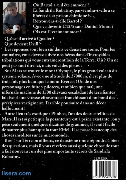 - Où Bartol a-t-il été emmené ?- Et Sandrila Robatiny, parviendra-t-elle à se libérer de sa prison chimique ?... Retrouvera-t-elle Bartol ?- Que va devenir C12/5 sans Daniol Murat ?- Ols est-il vraiment mort ?- Qu'est-il arrivé à Quader ?- Que devient Drill ?Les réponses sont bien sûr dans ce deuxième tome. Pour les connaître, vous devrez suivre nos héros dans d'incroyables tribulations qui vous entraîneront loin de la Terre. Où ? On ne peut pas tout dire ici, mais voici des pistes :Sur Mars se trouve le mont Olympe, le plus grand volcan du système solaire. Avec une altitude de 27000 m, il est plus de trois fois plus haut que le mont Everest ! Un de nos personnages en fuite y pilotera, tant bien que mal, une infernale machine de 1500 chevaux escaladant de terrifiantes falaises à une vitesse effrayante et franchissant d'un bond des précipices vertigineux. Terrible poursuite dans un décor hallucinant !Autre lieu très exotique : Phobos, l'un des deux satellites de Mars. Il est si petit que la pesanteur y est à peine existante ; on y pèse seulement quelques dizaines de grammes, il serait facile de sauter plus haut que la tour Eiffel. Il se passe beaucoup des choses insolites sur ce micromonde.Bref ! sur Terre ou ailleurs, ce deuxième tome répondra à bien des questions, mais il vous révélera aussi quelque chose de tout à fait nouveau : un des plus importants secrets de Sandrila Robatiny. En neurophysiologie, l'engramme est la trace biologique de la mémoire laissée par les évènements dans le cerveau, constituant le support matériel du souvenir.