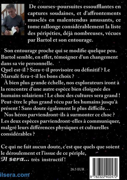 De courses-poursuites essoufflantes en captures soudaines, et d'affrontements musclés en malentendus amusants, ce tome rallonge considérablement la liste des péripéties, déjà nombreuses, vécues par Bartol et son entourage.Son entourage proche... qui se modifie quelque peu. Sa vie personnelle semble, en effet, prendre un tournant important. Quel est-il ? Sera-t-il provisoire ou définitif ? Le Marsalè fera-t-il les bons choix ?À bien plus grande échelle, nos explorateurs iront à la rencontre d'une autre espèce très éloignée des humains solairiens. Le choc des cultures sera grand ! Peut-être le plus grand jamais vécu par les enfants du Soleil ! Sans doute également le plus difficile.Nos héros parviendront-ils à le surmonter ? Les deux espèces parviendront-elles à communiquer, malgré leurs différences physiques et culturelles considérables ?Ce qui ne fait aucun doute, c'est que quels que soient le déroulement et l'issue de ce périple, Il sera... très instructif !