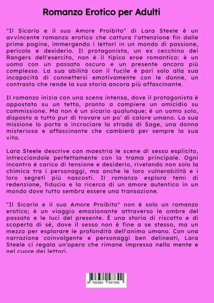 "Il Sicario e il suo Amore Proibito" di Lara Steele è un avvincente romanzo erotico che cattura l'attenzione fin dalle prime pagine, immergendo i lettori in un mondo di passione, pericolo e desiderio. Il protagonista, un ex cecchino dei Rangers dell'esercito, non è il tipico eroe romantico: è un uomo con un passato oscuro e un presente ancora più complesso. La sua abilità con il fucile è pari solo alla sua incapacità di connettersi emotivamente con le donne, un contrasto che rende la sua storia ancora più affascinante.Il romanzo inizia con una scena intensa, dove il protagonista è appostato su un tetto, pronto a compiere un omicidio su commissione. Ma non è un sicario qualunque; è un uomo solo, disposto a tutto pur di trovare un po' di calore umano. La sua missione lo porta a incrociare la strada di Sage, una donna misteriosa e affascinante che cambierà per sempre la sua vita.Lara Steele descrive con maestria le scene di sesso esplicito, intrecciandole perfettamente con la trama principale. Ogni incontro è carico di tensione e desiderio, rivelando non solo la chimica tra i personaggi, ma anche le loro vulnerabilità e i loro segreti più nascosti. Il romanzo esplora temi di redenzione, fiducia e la ricerca di un amore autentico in un mondo dove tutto sembra essere una transazione."Il Sicario e il suo Amore Proibito" non è solo un romanzo erotico; è un viaggio emozionante attraverso le ombre del passato e le luci del presente. È una storia di riscatto e di scoperta di sé, dove il sesso non è fine a se stesso, ma un mezzo per esplorare le profondità dell'animo umano. Con una narrazione coinvolgente e personaggi ben delineati, Lara Steele ci regala un'opera che rimane impressa nella mente e nel cuore dei lettori.Perfetto per chi ama i romanzi erotici con una trama avvincente e personaggi complessi, "Il Sicario e il suo Amore Proibito" è un must-read che non deluderà le aspettative. Disponibile su varie piattaforme online, questo libro è pronto a conquistare ilpubblico con la sua miscela unica di passione e suspense.