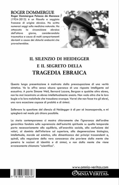 Questa lunga presentazione è motivata dalla preoccupazione di una verità sintetica. Ve la consegno senza alcuna speranza di una risposta intelligente ed esauriente. A parte Simone Weil, Bernard Lazare, Bergson e qualche altro ebreo, non ho mai incontrato un ebreo intellettualmente onesto. Non vedo altro che le loro bugie e la loro malafede che trasudano ovunque. Vorrei non essere tra gli ebrei, una rara eccezione capace di probità e di sintesi. Sollevare la questione del silenzio di Heidegger è già di per sé inconsapevole e mi spiegherò nel modo più chiaro possibile. La storia contemporanea ci mostra chiaramente che l'ignoranza dell'ordine gerarchico fondato sulla supremazia dell'autorità spirituale su quella temporale, porta necessariamente allo squilibrio, all'anarchia sociale, alla confusione dei valori, al dominio dell'inferiore sul superiore, alla degenerazione biologica, intellettuale, morale ed estetica, all'oblio dei principi trascendenti e quindi alla negazione della vera conoscenza che proviene dalla mente che penetra le nozioni di identità e di sintesi, e non dalla mente che viene erroneamente chiamata scientifica...