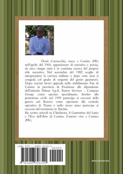 Comprendo bene che la parola poeta appartiene a quegli autori ormai noti e immortali e come tali hanno l'ammirazione e la stima, oltre che mia, di tutto il mondo letterario. Nonostante la mia età abbia effettuato il giro di bolina già da un anno ormai, nel 2007 la mia penna inizia a gettare inchiostro su fogli bianchi distratti da libri e giornali quotidiani, fino ad arrivare a leggermi pensieri e parole ispirate dal mistero della vita, quale l'amore e la ricerca di verità che appartengono forse solo all'Universo. Questo libro tratta la poesia in genere, racconti brevi, poesia nipponica acrostici e aforismi da me sviluppati Un ringraziamento particolare va alla mia famiglia che con amore e pazienza ha saputo invogliarmi nello scrivere, e ai miei genitori che mi hanno regalato la vita e che vegliano su tutti noi istante dopo istante.