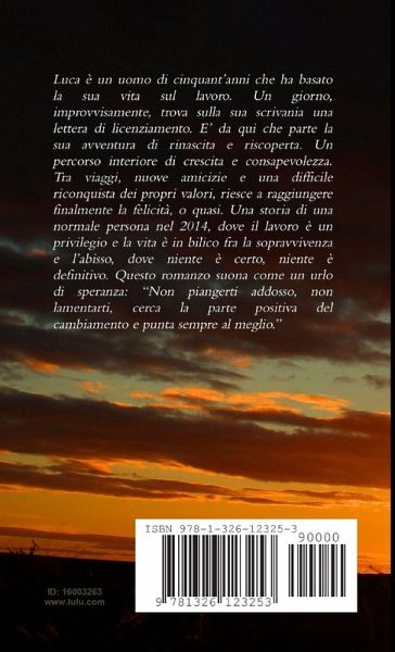 Luca è un uomo di cinquant'anni che ha basato la sua vita sul lavoro. Un giorno, improvvisamente, trova sulla sua scrivania una lettera di licenziamento. E' da qui che parte la sua avventura di rinascita e riscoperta. Un percorso interiore di crescita e consapevolezza. Tra viaggi, nuove amicizie e una difficile riconquista dei propri valori, riesce a raggiungere finalmente la felicità, o quasi. Una storia di una normale persona nel 2014, dove il lavoro è un privilegio e la vita è in bilico fra la sopravvivenza e l'abisso, dove niente è certo, niente è definitivo. Questo romanzo suona come un urlo di speranza: "Non piangerti addosso, non lamentarti, cerca la parte positiva del cambiamento e punta sempre al meglio."