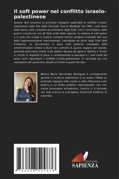 Questo libro esamina le principali categorie applicabili al conflitto israelo-palestinese dalla fine della Seconda Guerra Mondiale nel 1945, sulla base delle teorie sulla creazione ed estinzione degli Stati. Con il consolidarsi delle guerre successive con gli Stati arabi della regione, la nozione di soft power e il ruolo che svolge in questo contesto storico vengono analizzati alla luce della regolamentazione internazionale, soprattutto da parte degli Stati Uniti d'America. La discussione si basa sulle politiche sviluppate dalle amministrazioni Clinton e Bush nei confronti di questa regione del mondo, ponendo particolare enfasi sulla politica attuata dai governi Obama e Trump in merito ai negoziati di pace, e contemplando le posizioni e i ruoli svolti dai paesi vicini riguardanti il ¿¿conflitto israelo-palestinese. Si conclude con una valutazione del panorama attuale di fronte a questi territori.