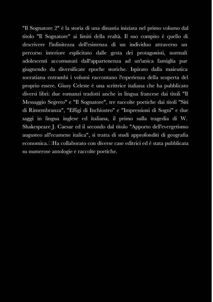 "Il Sognatore 2" è la storia di una dinastia iniziata nel primo volumo dal titolo "Il Sognatore" ai limiti della realtà. Il suo compito è quello di descrivere l'infinitezza dell'esistenza di un individuo attraverso un percorso interiore esplicitato dalle gesta dei protagonisti, normali adolescenti accomunati dall'appartenenza ad un'unica famiglia pur giugnendo da diversificate epoche storiche. Ispirato dalla maieutica socratiana entrambi i volumi raccontano l'esperienza della scoperta del proprio essere. Giusy Celeste è una scrittrice italiana che ha pubblicato diversi libri: due romanzi tradotti anche in lingua francese dai titoli "Il Messaggio Segreto" e "Il Sognatore", tre raccolte poetiche dai titoli "Siti di Rimembranza", "Effigi di Inchiostro" e "Impressioni di Sogni" e due saggi in lingua inglese ed italiana, il primo sulla tragedia di W. Shakespeare J. Caesar ed il secondo dal titolo "Apporto dell'evergetismo augusteo all'ecumene italica", si tratta di studi approfonditi di geografia economica. Ha collaborato con diverse case editrici ed è stata pubblicata su numerose antologie e raccolte poetiche.