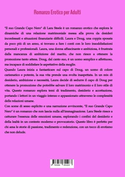 "Il suo Grande Capo Nero" di Lara Steele è un romanzo erotico che esplora le dinamiche di una relazione matrimoniale messa alla prova da desideri inconfessati e situazioni finanziarie difficili. Laura e Doug, una coppia sposata da poco più di un anno, si trovano a fare i conti con le loro insoddisfazioni personali e professionali. Laura, una donna affascinante e ambiziosa, è frustrata dalla mancanza di ambizione del marito, che non riesce a ottenere la promozione tanto attesa. Doug, dal canto suo, è un uomo semplice e affettuoso, ma incapace di soddisfare le aspettative della moglie.Quando Laura inizia a fantasticare sul capo di Doug, un uomo di colore carismatico e potente, la sua vita prende una svolta inaspettata. In un mix di desiderio, ambizione e necessità, Laura decide di sedurre il capo di Doug per ottenere la promozione che potrebbe salvare il loro matrimonio e il loro stile di vita. Questo romanzo esplora temi di tradimento, desiderio e accettazione, portando i lettori in un viaggio intenso e appassionato attraverso le complessità delle relazioni umane.Con scene di sesso esplicito e una narrazione avvincente, "Il suo Grande Capo Nero" è un romanzo che non lascia nulla all'immaginazione. Lara Steele riesce a catturare l'essenza delle emozioni umane, esplorando i confini del desiderio e della lealtà in un contesto moderno e provocatorio. Questo libro è perfetto per chi ama le storie di passione, tradimento e redenzione, con un tocco di erotismo che non delude.