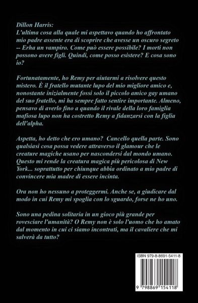 Dillon Harris: L'ultima cosa che mi sarei aspettato quando decisi di affrontare il padre che mi aveva rifiutato, era di scoprire che avesse un oscuro segreto: era un vampiro. Come poteva essere possibile? I vampiri non possono avere figli. Quindi, come avevo fatto a nascere? Qual era la mia vera natura? Fortunatamente, ho Remy che mi aiuta a risolvere questo mistero. È il fratello lupo mutaforma del mio migliore amico e, nonostante inizialmente il per lui fossi solo il piccolo amico gay umano di suo fratello, mi aveva sempre fatto sentire importante. Pensavo ormai di averlo conquistato quando il lupo rivale della loro famiglia mafiosa non aveva costretto Remy a fidanzarsi con la figlia dell'alfa. Aspetta, ho detto che sono umano? Dimentichiamolo. Sono qualsiasi cosa possa vedere attraverso gli incantesimi che le creature magiche usano per nascondersi dal mondo umano. Questo mi rende la creatura magica più pericolosa di New York... soprattutto per chiunque abbia ordinato a mio padre di convincere mia madre di essere incinta. Ora non ho nessuno a proteggermi. Anche se, a giudicare dal modo in cui Remy mi spoglia con lo sguardo, forse uno ce l'ho. Sono una pedina solitaria in un gioco più grande teso a conquistare l'umanità? Oppure Remy non è solo l'uomo che ho amato dal momento in cui ci siamo incontrati, ma il cavaliere che mi salverà da tutto? Nota: Questo libro fa parte della collezione "L'amore è amore" dell'autore, quindi è disponibile come storia d'amore piccante in "Il matrimonio mafioso forzato del mio amico", come storia d'amore MM a lieto fine con lupo mutaforma in "Il mio lupo mafioso", come storia d'amore MM a lieto fine in "I guai di un matrimonio mafioso", e come storia d'amore MM a lieto fine con lupo mutaforma in "Il suo Lupo protettore".