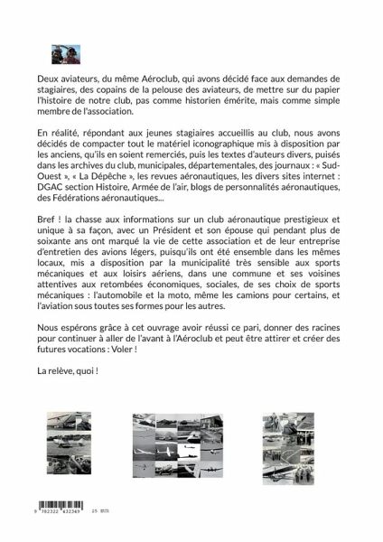 En réalité, répondant aux jeunes stagiaires accueillis au club, nous avons décidés de compacter tout le matériel iconographique mis à notre disposition par les anciens, qu'ils en soient remerciés, puis les textes d'auteurs divers, puisés dans archives municipales, départementale, des journaux locaux "Sud-Ouest", "La Dépêche" , les revues aéronautiques, les divers sites Internet des Fédérations sportives et de loisirs aéronautiques, et les divers conteurs méconnus du club. Un vrais régal ! Nous espérons grâce à cet ouvrage avoir réussi , donner des racines pour continuer à aller de l'avant à l'Aéroclub et peut être attirer et créer des futures vocations: Voler !La relève, quoi !
