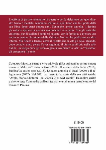 L'euforia di partire volontario in guerra e poi la delusione per quel disastro fisico e mentale, sembrano sparire su quel treno che lo riporta dalla sua Nina, dopo quasi cinque anni. Senonché, anche stavolta, il destino gli volta le spalle e la sua vita sentimentale va a pezzi. Non gli resta che emigrare, pur di tagliare i ponti col passato, con la famiglia, e provare una nuova avventura: le miniere della Vallonia. Non sa che quello sarà un altro inferno. Ma Rocco è tenace, cerca il riscatto che la vita gli deve. Quando, dopo quindici anni, pensa d'aver raggiunto il giusto equilibrio nella solitudine, un telegramma gli sconvolgerà nuovamente la vita: un "bastardo" gli presenterà il conto.