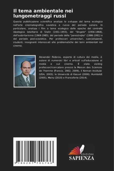 Questa pubblicazione scientifica analizza lo sviluppo del tema ecologico nell'arte cinematografica sovietica e russa del periodo sonoro. In particolare, analizza i film a tema ecologico delle epoche del controllo ideologico totalitario di Stalin (1931-1955), del "disgelo" (1956-1968), dell'autoritarismo (1969-1985), del periodo della "perestrojka" (1986-1991) e del periodo post-sovietico. Per professori universitari, specializzandi, studenti, insegnanti interessati alle problematiche dei temi ambientali nel cinema.