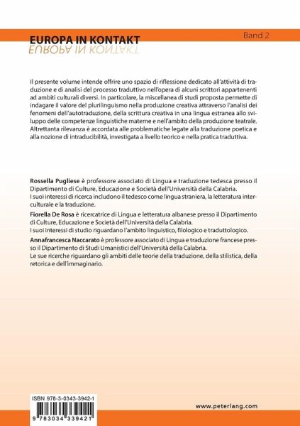 R. Rossella Pugliese è professore associato di Lingua e traduzione tedesca presso il Dipartimento di Culture, Educazione e Società dell¿Università della Calabria. I suoi interessi di ricerca includono il tedesco come lingua straniera, la letteratura interculturale e la traduzione. Fiorella De Rosa è ricercatrice di Lingua e letteratura albanese presso il Dipartimento di Culture, Educazione e Società dell¿Università della Calabria. I suoi interessi di studio riguardano l¿ambito linguistico, filologico e traduttologico. Annafrancesca Naccarato è professore associato di Lingua e traduzione francese presso il Dipartimento di Studi Umanistici dell¿Università della Calabria. Le sue ricerche riguardano gli ambiti delle teorie della traduzione, della stilistica, della retorica e dell¿immaginario.