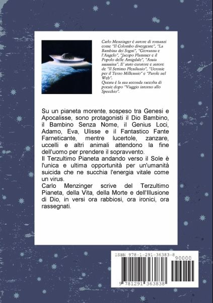 Su un pianeta morente, sospeso tra Genesi e Apocalisse, sono protagonisti il Dio Bambino, il Bambino Senza Nome, il Genius Loci, Adamo, Eva, Ulisse e il Fantastico Fante Farneticante, mentre lucertole, zanzare, uccelli e altri animali attendono la fine dell'uomo per prendere il sopravvento. Il Terzultimo Pianeta andando verso il Sole è l'unica e ultima opportunità per un'umanità suicida, che ne succhia l'energia vitale come un virus. Carlo Menzinger scrive del Terzultimo Pianeta, della Vita, della Morte e dell'Illusione di Dio, in versi, ora rabbiosi, ora ironici, ora rassegnati.