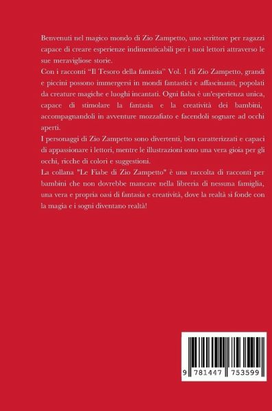 Il primo volume della collana "Le fiabe di zio Zampetto", "Il tesoro della fantasia" è un vero capolavoro di fantasia e avventura! Zio Zampetto, lo scrittore di queste meravigliose storie per bambini, ci porta in mondi fantastici popolati da creature affascinanti e luoghi incantati, dove magia e creatività regnano sovrane. Il libro è arricchito da splendide illustrazioni che catturano subito l'attenzione dei bambini, mentre la scrittura di Zio Zampetto è fresca ed evocativa, capace di far vivere ai lettori esperienze indimenticabili. I personaggi sono divertenti e ben caratterizzati, mentre l'atmosfera generale è sempre ricca di sorprese ed emozioni. Il primo volume della collana "Le fiabe di zio Zampetto" è un libro che non deluderà le aspettative di grandi e piccini: una raccolta di racconti che stimola la fantasia, la creatività e l'immaginazione dei bambini, portandoli in mondi magici e meravigliosi. ¿ Con splendide illustrazioni e storie meravigliosamente realizzate, questo libro ti farà sicuramente sorridere da un orecchio all'altro. ¿ Questa incantevole raccolta di storie amate è perfetta per i bambini ed è garantito per catturare i loro cuori!