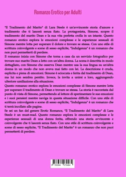 "Il Tradimento del Marito" di Lara Steele è un'avvincente storia d'amore e tradimento che ti lascerà senza fiato. La protagonista, Simone, scopre il tradimento del marito Dean e la sua vita perfetta crolla in un istante. Questo romanzo erotico esplora le emozioni complesse e le esperienze sessuali di Simone mentre lotta per superare il dolore e trovare se stessa. Con uno stile di scrittura coinvolgente e scene di sesso esplicite, "Indulgenza" è un romanzo che non puoi permetterti di perdere.Il romanzo inizia con Simone che torna a casa da un servizio fotografico per trovare suo marito Dean a letto con un'altra donna. La scena è descritta in modo dettagliato, con Simone che osserva Dean mentre usa la sua lingua su un'altra donna in un modo che non aveva mai fatto con lei. La descrizione è cruda, esplicita e piena di emozioni. Simone è scioccata e ferita dal tradimento di Dean, ma lui non sembra pentito. Invece, la invita a unirsi a loro, aggiungendo ulteriore umiliazione alla situazione.Questo romanzo erotico esplora le emozioni complesse di Simone mentre lotta per superare il tradimento di Dean e trovare se stessa. La storia è raccontata dal punto di vista di Simone, permettendo al lettore di sperimentare le sue emozioni e i suoi pensieri mentre naviga in questa situazione difficile. Con uno stile di scrittura coinvolgente e scene di sesso esplicite, "Indulgenza" è un romanzo che ti terrà incollato alle pagine.Se sei un fan del genere Erotic Romance, "Il Tradimento del Marito" di Lara Steele è un must-read. Questo romanzo esplora le emozioni complesse e le esperienze sessuali di una donna ferita, offrendo una storia avvincente e coinvolgente che ti lascerà senza fiato. Con uno stile di scrittura coinvolgente e scene di sesso esplicite, "Il Tradimento del Marito" è un romanzo che non puoi permetterti di perdere.
