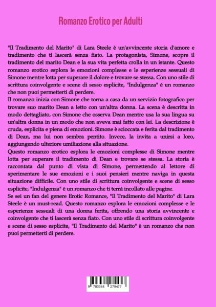 "Il Tradimento del Marito" di Lara Steele è un'avvincente storia d'amore e tradimento che ti lascerà senza fiato. La protagonista, Simone, scopre il tradimento del marito Dean e la sua vita perfetta crolla in un istante. Questo romanzo erotico esplora le emozioni complesse e le esperienze sessuali di Simone mentre lotta per superare il dolore e trovare se stessa. Con uno stile di scrittura coinvolgente e scene di sesso esplicite, "Indulgenza" è un romanzo che non puoi permetterti di perdere.Il romanzo inizia con Simone che torna a casa da un servizio fotografico per trovare suo marito Dean a letto con un'altra donna. La scena è descritta in modo dettagliato, con Simone che osserva Dean mentre usa la sua lingua su un'altra donna in un modo che non aveva mai fatto con lei. La descrizione è cruda, esplicita e piena di emozioni. Simone è scioccata e ferita dal tradimento di Dean, ma lui non sembra pentito. Invece, la invita a unirsi a loro, aggiungendo ulteriore umiliazione alla situazione.Questo romanzo erotico esplora le emozioni complesse di Simone mentre lotta per superare il tradimento di Dean e trovare se stessa. La storia è raccontata dal punto di vista di Simone, permettendo al lettore di sperimentare le sue emozioni e i suoi pensieri mentre naviga in questa situazione difficile. Con uno stile di scrittura coinvolgente e scene di sesso esplicite, "Indulgenza" è un romanzo che ti terrà incollato alle pagine.Se sei un fan del genere Erotic Romance, "Il Tradimento del Marito" di Lara Steele è un must-read. Questo romanzo esplora le emozioni complesse e le esperienze sessuali di una donna ferita, offrendo una storia avvincente e coinvolgente che ti lascerà senza fiato. Con uno stile di scrittura coinvolgente e scene di sesso esplicite, "Il Tradimento del Marito" è un romanzo che non puoi permetterti di perdere.