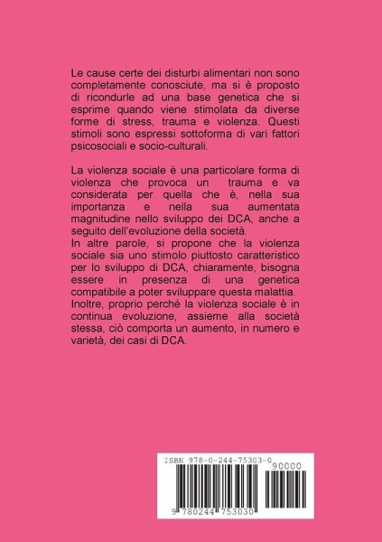 Le cause certe dei disturbi alimentari non sono completamente conosciute, ma si è proposto di ricondurle ad una base genetica che si esprime quando viene stimolata da diverse forme di stress, trauma e violenza. Questi stimoli sono espressi sottoforma di vari fattori psicosociali e socio-culturali. La violenza sociale è una particolare forma di violenza che provoca un trauma e va considerata per quella che è, nella sua importanza e nella sua aumentata magnitudine nello sviluppo dei DCA, anche a seguito dell'evoluzione della società. In altre parole, si propone che la violenza sociale sia uno stimolo piuttosto caratteristico per lo sviluppo di DCA, chiaramente, bisogna essere in presenza di una genetica compatibile a poter sviluppare questa malattia. Inoltre, proprio perché la violenza sociale è in continua evoluzione, assieme alla società stessa, ciò comporta un aumento, in numero e varietà, dei casi di DCA.