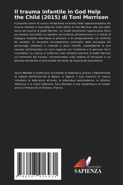 Il presente lavoro di ricerca intraprende un'analisi della rappresentazione del trauma infantile in God Help the Child (2015) di Toni Morrison alla luce della teoria del trauma di Judith Herman. Lo studio testimonia l'oppressione fisica ed emotiva esercitata sui bambini nel contesto afroamericano e si sforza di indagare modalità alternative di pensiero e di comportamento nei confronti dei bambini. Si concentra principalmente sull'analisi della psicologia dei personaggi sottoposti a molestie e abusi infantili, capitalizzando le loro carenze nell'alimentare un sano rapporto con l'ambiente e le persone che li circondano. La ricerca si sofferma sulle intuizioni teoriche di Judith Herman sul fenomeno del trauma, concentrandosi sulla nozione di intrusione e sul disturbo borderline di personalità derivante da esperienze traumatiche.